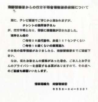 中新網(wǎng)8月6日電 5日,日本警方透露下落不明的女星酒井法子曾經(jīng)出現(xiàn)在山梨縣身延山附近。丈夫高相祐一因?yàn)閿y帶毒品被警方逮捕以后,酒井法子帶著兒子為什么會(huì)出現(xiàn)在山梨縣境內(nèi)惹起網(wǎng)友眾多猜疑。