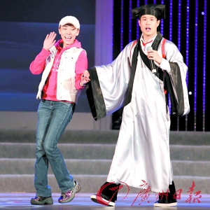 最讓人期待的小沈陽,雖然這次“爺們”了不少,沒再穿蘇格蘭格子裙,著一套黑色西服出場,但讓人驚喜的段子也就只有以水果比喻女人以及唱著粵語歌、背著喜羊羊書包扮寧采臣出場演《倩女幽魂》那一段,他和老婆沈春陽的調(diào)侃以及《大話西游》的小品依然是炒冷飯。不過,小沈陽一出場,觀眾的情緒就明顯高漲,還先后有兩位大膽女粉絲上臺送花獻吻,完全當(dāng)同臺的沈春陽“透明”。