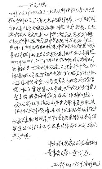4,對(duì)于有關(guān)媒體沒(méi)有經(jīng)過(guò)核實(shí)發(fā)表“虛假報(bào)道”,中華衛(wèi)星電視集團(tuán)有限公司保留通過(guò)法律程序追究其法律責(zé)任的權(quán)利。