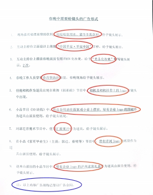 在清單里能看到的部分內(nèi)容包括,“現(xiàn)場(chǎng)嘉賓桌擺放贊助飲料娃哈哈飲用水、蒙牛牛乳飲料,給予鏡頭展示”;“互動(dòng)主持臺(tái)立面設(shè)計(jì)上體現(xiàn)‘中國(guó)平安·平安中國(guó)’字樣,給予鏡頭展示”;“春晚工作人員穿著喬丹贊助的服裝,春晚現(xiàn)場(chǎng)給予鏡頭展示”;“佳能相機(jī)作為道具出現(xiàn)在歌舞《拍拍拍》節(jié)目中,相機(jī)及相機(jī)掛帶上的logo在鏡頭中出現(xiàn)”;“小品節(jié)目《50塊錢》中,魯花食用油在面案或小桌上擺放,貼有企業(yè)Logo的圍裙作為道具由演員使用,給予鏡頭展現(xiàn)”;“劉謙近景魔術(shù)節(jié)目中,使用匯源果汁作為道具,給予鏡頭展示”;“趙本山演出的小品節(jié)目中帶有企業(yè)的logo的瀘州老窖禮盒作為道具由演員使用,給予鏡頭展示!