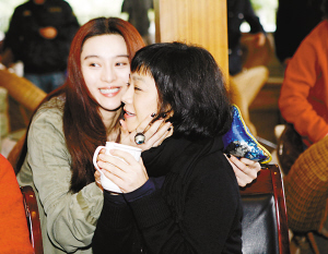 本報(bào)成都專電 由女導(dǎo)演李玉執(zhí)導(dǎo),范冰冰、陳柏霖、張艾嘉主演的電影《觀音山》正在成都熱拍,昨日,劇組在位于成都龍泉驛的拍攝地接受媒體探班,首次合作的內(nèi)地美女范冰冰和臺(tái)灣才女張艾嘉親密無(wú)間,在有記者稱她們兩個(gè)有點(diǎn)“不搭”時(shí),范冰冰還特意走上前來(lái),給張艾嘉一個(gè)親吻。
