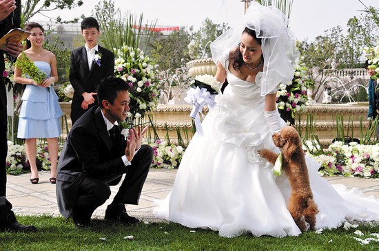 王學兵和孫寧別有新意地用他們的愛犬充當傳遞愛的使者,由愛犬將結婚戒指帶到現(xiàn)場。交換結婚戒指后,王學兵與孫寧舉起香檳向親友祝酒。