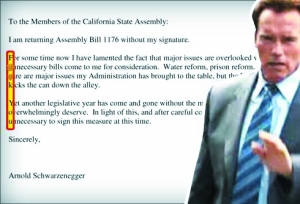 湯姆·阿米阿諾與幾位議員提出了一項法案,希望加州能在舊金山地區(qū)創(chuàng)建基礎(chǔ)設(shè)施融資區(qū),采取融資計劃推動這些地區(qū)的基礎(chǔ)設(shè)施建設(shè)。通常此類法案如果不是問題太多的話,州長會予以批準。但湯姆·阿米阿諾與施瓦辛格素來看不對眼,本月初又在集會上批評施瓦辛格的施政方式,還大罵他是“騙子”。施瓦辛格否決了這項提案,并在否決信上以藏頭詩的形式對阿米阿諾議員予以反擊,即信件每行第一個字母連起來就是“T(Tom),I f k you,A(Arnold Schwarzenegger)”。州長辦公室新聞發(fā)言人稱此事純屬巧合,“試想每天寫那么多否決信,這種巧合的出現(xiàn)是遲早的事!