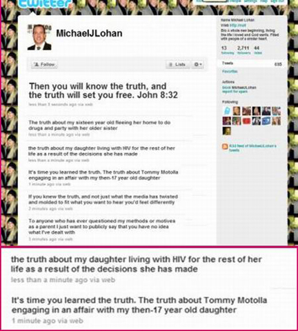 臺(tái)灣“今日新聞”報(bào)道稱(chēng),邁克爾在其微博上說(shuō),林賽現(xiàn)在的行徑會(huì)如此荒唐,完全是因?yàn)榈昧税滩,因此她決定就這樣渾渾噩噩過(guò)一生!但很快邁克爾卻突然將消息撤下,聲稱(chēng)自己的微博網(wǎng)頁(yè)被黑客入侵,網(wǎng)頁(yè)上所言都不是事實(shí)。