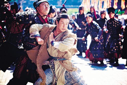 如果說(shuō)被鋼絲吊在半空“飛”難不倒小沈陽(yáng),那么接下來(lái)的打戲則是難度不小,因?yàn)樾∩蜿?yáng)聲稱不必用替身,而程小東又是有名的較真導(dǎo)演,對(duì)動(dòng)作細(xì)節(jié)的要求之苛刻達(dá)到“令人發(fā)指”的程度,因此小沈陽(yáng)接受了更大的挑戰(zhàn)。這段時(shí)間橫店悶熱難耐,有一場(chǎng)小沈陽(yáng)殺進(jìn)皇宮英雄救美的戲,對(duì)手演員是片中大反派——第一高手徐少?gòu)?qiáng)。這種天氣穿著厚厚的古裝拍戲,即便站著不動(dòng)都會(huì)汗流浹背,何況還是拍動(dòng)作戲,當(dāng)小沈陽(yáng)在程導(dǎo)的指揮下一遍遍拳打腳踢、跳躍騰挪后,早已是揮汗如雨,幾乎每拍一個(gè)鏡頭都要換下一身汗?jié)竦膽蚍?/p>
