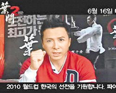 臺灣《中國時報》消息稱,《葉問2》遠征韓國,甄子丹正在拍《關(guān)云長》無法前往,因此錄了約2分鐘的短片向韓國觀眾問好。他以韓文打招呼,接著說:“韓國是亞洲足球強國,希望韓國隊在本屆世界杯有優(yōu)秀表現(xiàn)!彼說自己是曼聯(lián)隊韓國選手樸智星的球迷。