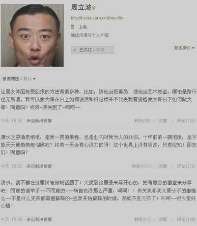 采訪首先圍繞關(guān)周分手。周立波說:“我很無辜,老關(guān)也很無辜,有人在中間挑事,我們會(huì)查的!彼嬖V記者,知道媒體“踢爆”兩人分手一事時(shí),他正在與前紐約警察局華人局長莫虎一起喝酒,而當(dāng)天下午他剛在無畏號航母上看了“珍珠港事件”的紀(jì)錄片,當(dāng)時(shí)他的第一個(gè)反應(yīng)是“沒想到我也遇上珍珠港事件了”。由于當(dāng)時(shí)認(rèn)為是關(guān)棟天向媒體“踢爆”此事,而且當(dāng)晚酒喝得比較多,因而在微博上寫下了幾段很有爭議的博文,包括“泡飯鮑魚”說。“結(jié)果阿春(孫徐春)用人格向我擔(dān)保決不是‘老怪頭’(周立波和孫徐春對關(guān)棟天的昵稱)說出去的,我相信他!敝芰⒉ū硎,此次分手只是藝術(shù)和商業(yè)上的分手,兩人的藝術(shù)觀點(diǎn)不同。