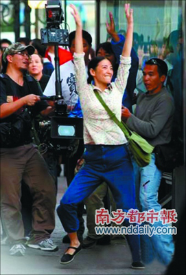 日前,電影《跳出來(lái)》在上海拍攝,這部由馮德倫執(zhí)導(dǎo),周星馳監(jiān)制,張雨綺、陳冠希和吳彥祖主演的電影吸引了不少人的目光。當(dāng)然其中最受關(guān)注的還屬“星女郎”張雨綺。探班當(dāng)天,張雨綺的造型讓記者驚訝,麻花辮、黑布鞋、深藍(lán)工裝褲、小碎花襯衫,儼然一個(gè)70年代初的村姑!靶桥伞边一個(gè)勁地在眾人面前扭腰,可能由于露天扭腰委實(shí)不好意思,小妮子NG不斷。