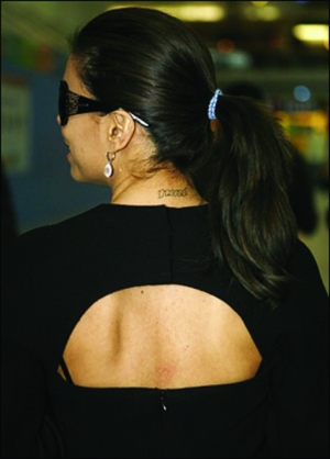 愛(ài)的文身,這一招早就不新鮮了。不過(guò),在三級(jí)片、性丑聞這樣的陰影之下,“瘋狂主婦”伊娃還是使出了這一招,文的是她球星老公托尼的球衣號(hào)碼9(NINE)。最近她和辣妹維多利亞走得很近,估計(jì)是偷學(xué)了一招。