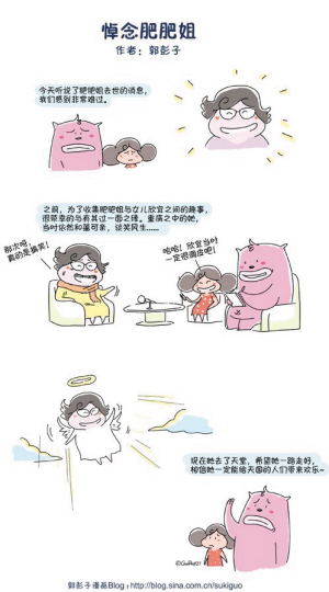 而創(chuàng)作人郭彭子也更新博客,貼出以“悼念肥姐”為題的3幅插圖,借此悼念這位“開(kāi)心果”,內(nèi)容描繪肥姐過(guò)世消息令人非常難過(guò),又將肥姐幻化成天使(上圖),祝她一路好走。