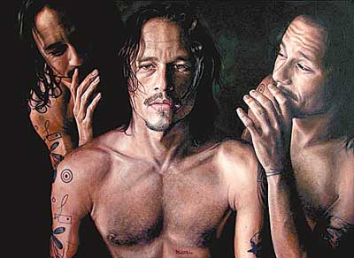希斯•萊杰生前與好友Vincent Fantauzzo計劃打造一幅自己的肖像。據(jù)后者透露,在這幅由他完成、取名為“希斯”的肖像畫中,中間占主導(dǎo)地位的“希斯•萊杰”面目茫然,旁邊兩個“希斯•萊杰”正在他耳邊低語。(張明天)