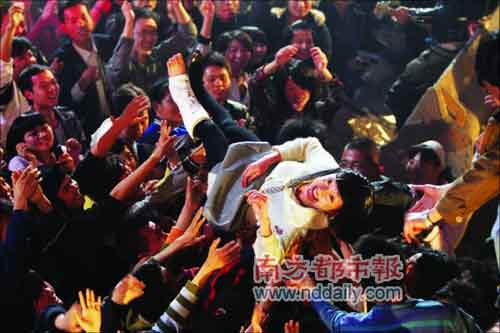 周迅在片中號稱飾演12個角色,當(dāng)天她的戲份卻非常獨特:在搖滾演唱會現(xiàn)場,人群中忽然躁動起來,歌迷以搖滾演唱會上最常見的人體輸送帶的方式將她傳送到了舞臺上!而周迅的腳上竟然打著石膏繃帶。