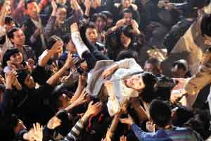 當(dāng)中拍攝一場(chǎng)搖滾音樂(lè)會(huì),為配合劇情需要,周迅穿上白色長(zhǎng)毛衣露面,不過(guò)右腿卻打上石膏,原來(lái)這是導(dǎo)演的安排。但現(xiàn)場(chǎng)有人誤以為周迅真的受了傷,引起一陣恐慌。拍攝時(shí)現(xiàn)場(chǎng)500名臨時(shí)演員更起哄將周迅抬起,像人肉輸送帶般送她上臺(tái),事后周迅大叫過(guò)癮,說(shuō)過(guò)程有如眾星拱月,令自己有女王般的感覺(jué),還笑言有機(jī)會(huì)的話(huà),希望模仿外國(guó)搖滾歌手般“跳水”,跳到臺(tái)下讓觀眾接住自己。