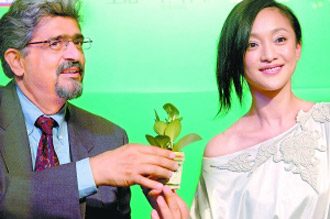 “大使”周迅首先給記者們“上了一課”:主辦方贈與每位與會者一盆小的盆栽植物,周迅拿起來看了看,說“綠色代表希望,這盆小植物是活的,請大家像愛護(hù)自己一樣愛護(hù)這個地球!苯又,突然意識到什么,她揭去了植物外面包裹著的塑料袋并說道,“在生活中,我們盡量不要使用塑料袋!