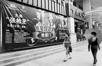記者核實:昨天下午2點多,記者在江濱路新時代影院樓下的千度酒吧門口看到了吳先生說的廣告。在千度酒吧門口右側(cè)的一副海報上,寫著“大陸張柏芝”、“大陸陳冠!币约皟扇说恼婷拖嚓P(guān)簡介,中間顯要位置是兩人照片和“明星零距離”、“艷照門”字樣。許多路人從海報前經(jīng)過都不禁瞄上一眼。