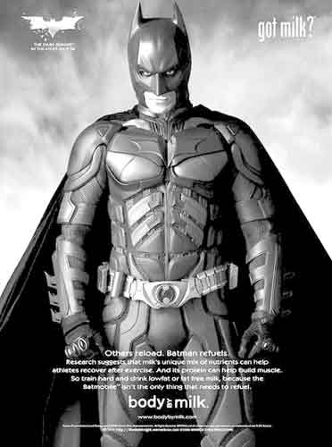 這次廣告的宣傳語(yǔ)是:“大家刻苦訓(xùn)練,然后喝低脂或脫脂牛奶吧。因?yàn)椴皇侵挥序饌b車(chē)需要加油!痹搹V告將于6月1日正式推出,而最新的蝙蝠俠系列電影則在7月18日上映。