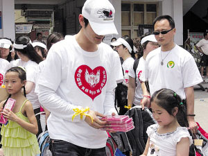 5月16日,在“5·12地震”發(fā)生的第四天,黃曉明帶著醫(yī)療和救援志愿隊趕到受災最嚴重的遵道鎮(zhèn)、漢旺鎮(zhèn)和死傷人數(shù)最為慘重的東方汽輪廠等地,以一名普通志愿者的身份默默幫忙。昨天,在兒童節(jié)這一天,黃曉明又親自率領自己的愛心基金會成員們,二度進入重災區(qū)綿陽安縣的數(shù)所小學,給孩子們帶去急缺的生活學習用品。本報記者昨天也全程陪同,見證了這位將慈善視之“習慣”的明星的真性情一面。