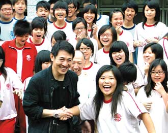 李連杰(左)昨天下午到南投縣集集國中,與學生們相見歡。