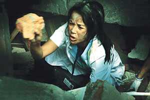 劇照中,蔣雯麗蹲在一片廢墟之中,身上、臉上全是泥,她用雙手在鋼筋瓦礫的廢墟中扒找自己的同事和醫(yī)藥箱。拍攝現場,混凝土塊還懸在半空中,搖搖欲墜。