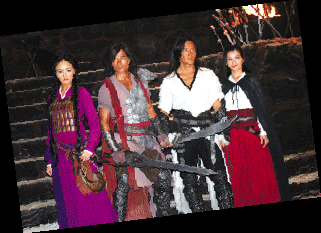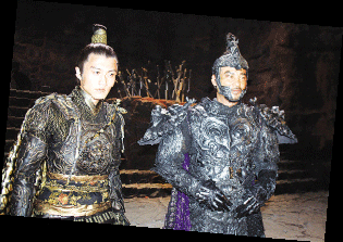 走進(jìn)一間已經(jīng)被布置成刑房的攝影棚,巖石碎塊構(gòu)成了粗糙的地面,幾把劍插成了劍壇,臺階上火爐冒著火苗,空中還懸著幾塊爬著蟲蛆的火腿,幾臺鼓風(fēng)機(jī)正開足馬力吹著風(fēng)……看前面,一堆人正在你推我一把,我攻你一招,原來替身正在幫任達(dá)華試戲。對披著長發(fā)造型的鄭伊健、郭富城以及何家勁來說,炎熱恰是專門跟耍帥作對的。問到郭富城對于造型的看法,郭富城當(dāng)即冒出一句“非常熱”,F(xiàn)場汗流浹背的阿Sa抱怨說,飾演聶風(fēng)的鄭伊健可謂是片中最舒服的一位,不僅戲服相對清涼,由于名為“風(fēng)”,因此拍戲的時候可以充分享受鼓風(fēng)機(jī)的待遇。