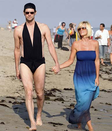 中新網(wǎng)7月7日電 好萊塢喜劇明星金·凱瑞趁美國(guó)獨(dú)立紀(jì)念日假期,和女友珍妮·麥卡錫一起在馬里布海灘散步,沒(méi)想到他身上穿的竟然是女友之前才剛穿的泳裝,十分搞笑。