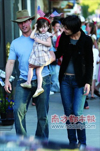 阿湯哥生于1962年7月3日,美國國慶日那天正好是他46歲生日的第二天。他一身西部牛仔裝扮,抱著寶貝女兒蘇瑞走在大街上,不時向圍觀的粉絲打招呼,也任身邊的狗仔隊拍照。然而,當(dāng)天的明星卻不是阿湯哥,而是他懷里2歲的小蘇瑞。蘇瑞戴著一個紅色發(fā)卡,上面插著兩面美國國旗,造型十分趣怪。尤其當(dāng)她在明星老爸懷里揮舞雙臂的時候,是街上十足的焦點(diǎn)人物。媽媽凱蒂一身黑衣十分低調(diào),她不時低頭跟女兒說話,有時也主動向在場的狗仔隊?wèi)c!皣鴳c快樂”。
