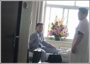 半個(gè)多小時(shí)后,一位醫(yī)生例行查房推開了任程偉的病房門,站在走廊里的記者看見任程偉身穿病號(hào)服斜躺在病床上,氣色有些灰暗,神情憔悴,雙腿好像不能動(dòng)彈。他回答醫(yī)生問題時(shí)聲音也很微弱,與他前不久登臺(tái)領(lǐng)獎(jiǎng)時(shí)神采飛揚(yáng)的樣子簡(jiǎn)直判若兩人,而醫(yī)生則一直在勸慰任程偉。醫(yī)生走后,病房里傳來了一陣手機(jī)鈴聲,任程偉強(qiáng)打精神地通著話,臉上露出勉強(qiáng)的笑容,通話結(jié)束后,他就疲倦地倒在了床上,熒屏上的硬漢此時(shí)看上去特別虛弱。隨后記者撥打任程偉的電話,電話已經(jīng)關(guān)機(jī),而他經(jīng)紀(jì)人的電話也已轉(zhuǎn)到秘書臺(tái),截至發(fā)稿時(shí)任程偉的病情還沒有得到進(jìn)一步的證實(shí)。 卓偉