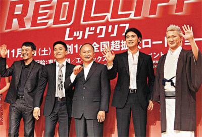 左起:張震、梁朝偉、吳宇森、金城武及中村獅童等,昨日現(xiàn)身日本出席《赤壁》記者會。