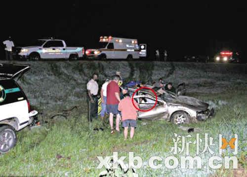 禍現(xiàn)場,摩根駕駛的車輛嚴(yán)重變形,救護(hù)人員正在搶救摩根。