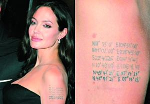 近日安吉麗娜·茱莉在新片《調(diào)包嬰兒》紐約首映禮時曝光了手臂上的新文身。記者仔細辨認才發(fā)現(xiàn)原來茱莉把她那雙胞胎孩子諾克斯與薇薇妮出生地的經(jīng)緯度都刻在上面,目前,該手臂已收錄其6個子女的出生地經(jīng)緯度。有媒體戲稱,茱莉的孩子來自五湖四海,弄得她自己都不記得了孩子從何而來,因此才把這些資料刻在手臂上,時刻提醒自己。