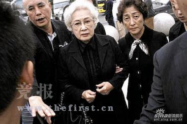 大廳內(nèi)的墻上掛著謝導(dǎo)的遺像,謝晉的遺體邊遍布鮮花,老人戴著眼鏡,就好像睡著了一般,旁邊還放著他最鐘愛的一頂帽子。一點(diǎn)十分左右,謝晉妻子徐大雯和其小兒子阿四到達(dá)追悼會(huì)現(xiàn)場(chǎng),強(qiáng)掩住內(nèi)心的悲傷,送謝導(dǎo)最后一程。這幾天,徐大雯堅(jiān)持從醫(yī)院出來,親自參與布置靈堂,盡管她剛剛安裝了心臟起搏器,精神狀態(tài)很不好。徐大雯這些天說得最多話是:“我不能倒,這個(gè)家總得有一個(gè)人撐著!弊蛉眨恢北憩F(xiàn)堅(jiān)強(qiáng)的徐大雯顯得非常憔悴,頭發(fā)花白,走路蹣跚,對(duì)著謝晉的遺體說了不少話。