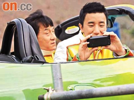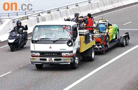 昨日清晨七時(shí),成龍與祖名穿超時(shí)空戰(zhàn)士的“父子裝”抵達(dá)青馬大橋,駕駛熒光黃色和綠色的左跑車(chē),車(chē)尾則放了一大箱冰凍道具樽裝茶,非常搶眼。坐在司機(jī)位的成龍?jiān)诠飞巷L(fēng)馳電掣,狀甚威風(fēng),其實(shí)他們的跑車(chē)被固定在貨車(chē)托尾板上,相反攝影師要站在托尾板上拍攝,當(dāng)有大風(fēng)或大貨車(chē)經(jīng)過(guò)扯風(fēng)時(shí),令攝影師搖搖欲墜,驚險(xiǎn)萬(wàn)分。