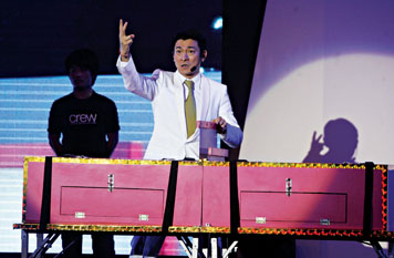 劉謙變魔術(shù),那是他的老本行,而劉德華就純粹是客串了,但在舞臺上的一招一式,劉德華倒并不業(yè)余。第一個魔術(shù)請出了他的“女朋友 ”:“她是我今天的女朋友哦!边呎f邊摸著美女的手,“為了公平起見,我要邀請媒體朋友一起來參與!薄斑有你,美女,我喜歡漂亮的……”還沒開始變魔術(shù),之前的噱頭已擺得夠足!皩⒚琅P(guān)在盒子里,用鋒利的刀等工具往下插,然后盒子分離,人也就此被分尸……”表演內(nèi)容并不陌生,但出自華仔之手,粉絲們看得津津有味,尖叫聲不斷!華仔究竟用了多少時間學(xué)會變這個魔術(shù)的呢?“這個是秘密,不能告訴你們!惫首魃衩氐娜A仔透露說,自己曾經(jīng)上過劉謙的節(jié)目,也跟他學(xué)了幾招。