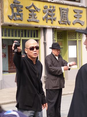根據(jù)劇組的通告,昨日《建國大業(yè)》劇組從早晨6點30分就開工拍攝。當(dāng)早報記者于中午時分趕到車墩時,導(dǎo)演黃建新正在“拍兩個不知名人士的戲份”,不見“蔣介石”的扮演者張國立,但劇組人員保證“張國立今天來了片場”。下午2點,劇組午休時間結(jié)束!澳暇┞贰鄙虾鋈欢喑隽艘蝗汉谝潞诿、幫派打扮的群眾演員。同時,一輛車輪外側(cè)被涂成金色的“另類”黃包車也出現(xiàn)在“南京路”的一頭。幾分鐘后,現(xiàn)場忽然一陣騷動,許多原本在附近休息的游客都涌向了“南京路”口,拿出相機拍個不停。原來是“杜月笙”馮小剛出現(xiàn)了。同時,還有一個光頭、戴著墨鏡、手執(zhí)大喇叭的男子,在給馮小剛以及現(xiàn)場的群眾演員安排走位。仔細一看,這位“現(xiàn)場導(dǎo)演”不是別人,正是“蔣介石”張國立。原來整個上午,張國立并沒有休息,而是呆在劇組在片場臨時設(shè)置的工作室內(nèi),和另一位導(dǎo)演韓三平一起,看之前拍攝的回放。