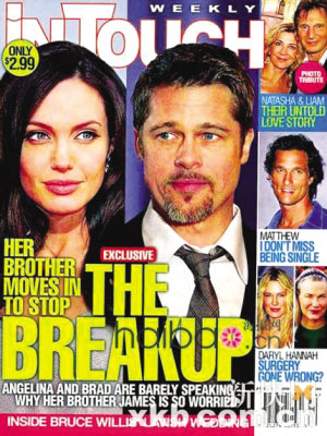 布拉德·皮特和安吉麗娜·朱莉的夢幻愛情,似乎有幻滅的趨勢。最近,不止一家的美國雜志報道了兩人的感情危機。就連臺灣媒體也不甘示弱,報道中稱布拉德·皮特、安吉麗娜·朱莉關(guān)系陷入冰點,兩人協(xié)議暫時分居。假如情勢無法挽回,小布將爭取六名子女的監(jiān)護權(quán),另外,高達2億美元的財產(chǎn)分配問題,恐怕也會讓這對“史密斯夫婦”展開廝殺。