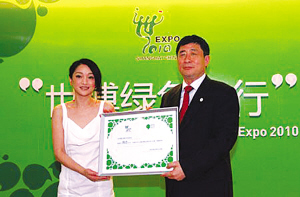 繼去年擔(dān)任“聯(lián)合國(guó)中國(guó)區(qū)首位親善大使”后,昨天周迅再度榮任上海世博會(huì)“綠色出行大使”,成為首位獲此榮譽(yù)的藝人。開始以雙重“大使”的身份,倡導(dǎo)低碳生活,為綠色出行獻(xiàn)上自己的一份力量。