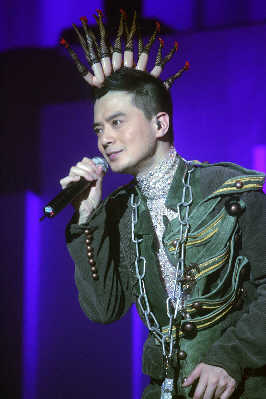 與其他流行歌手的演唱會相比,昨夜的上海大舞臺并未爆滿,但好在滿場都是黃耀明以及“人山人!钡乃乐曳劢z,所以當(dāng)周耀輝、當(dāng)李端嫻、當(dāng)AT17的ELLEN以及林一峰等人陸續(xù)入場,均收獲了粉絲的熱情尖叫。整個現(xiàn)場猶如“人山人!迸c家人的節(jié)日聚會一般熱鬧,還未開場,內(nèi)場前區(qū)已經(jīng)擠滿了隨著音樂跳躍的歌迷。當(dāng)燈光全部暗下,伴隨著歌迷熱情的歡呼聲,黃耀明猛然出現(xiàn)在舞臺正中,幕布尚未全部拉開,身著白色羽毛褲的黃耀明唱起歌曲《下世紀(jì)再嬉戲》。戴著黃耀明經(jīng)典的妖精耳朵或者頭頂白色長發(fā)的歌迷們開始集體大聲跟唱;蛟S對于不少死忠歌迷而言,這場演出仍然伴隨著許多遺憾,比如黃耀明的造型在早前許多演唱會上用過,開場的帽子曾在“滿天神佛”演唱會上用過,羽毛褲則曾在“光天化日”演唱會上穿過,而后換上的第二套衣服也曾在“達(dá)明一派為人民服務(wù)”演唱會上用過。但每當(dāng)他下臺換裝,場內(nèi)便會響起一陣陣期盼的歡呼聲,甚至有歌迷干脆對著停下來與歌迷打招呼的黃耀明大喊:“講廣東話!”對歌迷而言,能夠一次看到“滿天神佛”、“光天化日”以及黃耀明與港樂合作的三場演唱會的精華,也算是不虛此行。