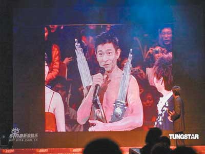 前晚(12月26日,下同),香港四大頒獎(jiǎng)典禮之一的“新城勁爆頒獎(jiǎng)禮2007”在灣仔會(huì)展中心舉行。劉德華、陳奕迅以及李克勤分奪5個(gè)獎(jiǎng)項(xiàng),成為全場(chǎng)之冠。由于劉德華前晚正在紅館舉行演唱會(huì),無法到達(dá)頒獎(jiǎng)現(xiàn)場(chǎng),主辦方竟把獎(jiǎng)杯送到華仔演唱會(huì)現(xiàn)場(chǎng),華仔第一次赤裸上身抱回5獎(jiǎng)。