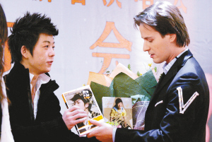 盡管場面沒有上次熱鬧,但是許多歌迷都是從上午接機,一路趕到發(fā)布會現(xiàn)場。一位楊姓高三女生專門和母親一起從保定趕到北京,為的就是一睹Vitas的風(fēng)采。其母親告訴記者,自己非常支持女兒,甚至連自己也喜歡上了Vitas。曾以一曲《歌劇2》征服聽眾的快男王櫟鑫也來到現(xiàn)場,把自己的唱片送給了Vitas。不過,當(dāng)主持人要求王櫟鑫飆一下高音時卻被王拒絕了。