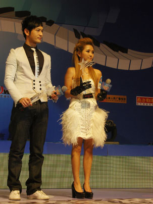 中新網(wǎng)3月14日電 日前,香港,眾星出席"9+2音樂(lè)先鋒頒獎(jiǎng)禮2007"大典。發(fā)行新專(zhuān)輯《明明不是angel》的何潔再度耀目香江,三次登臺(tái),獲得年度最佳女歌手和先鋒跳舞女歌手兩項(xiàng)重量級(jí)大獎(jiǎng),她激動(dòng)不已,表情十分夸張 。