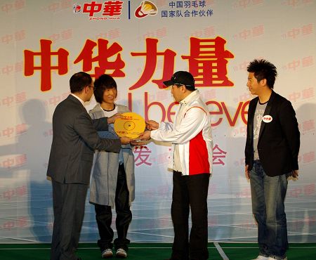 中新網(wǎng)3月21日電 中國(guó)國(guó)家羽球總教練李永波和內(nèi)地著名歌唱組合羽•泉,聯(lián)手演唱的《中華力量 I believe》在京首次公布,這是聯(lián)合利華旗下中華牙膏品牌為中國(guó)國(guó)家羽毛球?qū)φ鲬?zhàn)二零零八奧運(yùn)會(huì)而打造的歌曲,F(xiàn)場(chǎng),國(guó)家羽毛球隊(duì)出征08倒計(jì)時(shí)牌也同時(shí)啟動(dòng)。