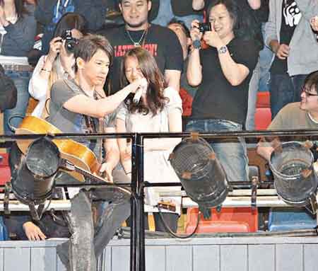 中新網(wǎng)3月26日電 “陶喆123我們都是木頭人”演唱會(huì)前晚(24日)尾場演出,陶喆男女通殺,除有男觀眾送花,亦有女觀眾借合唱機(jī)會(huì)表愛意,陶喆笑說第一次收到男士送花,但卻不接受男士示愛,并趁演唱會(huì)尾場機(jī)會(huì)宣布將做回本行執(zhí)導(dǎo)電影。