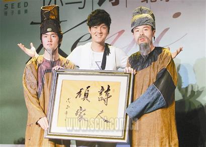 因為與“詩”有關,在昨日的發(fā)布會上,最先上場的不是主角吳克群,而是“穿越時空”前來捧場的中國古代先賢:最著名的大詩人“李白”、“杜甫”。在現(xiàn)場所有人的驚呼聲中,兩位年輕演員所扮演的大詩人,卻顯得心神不定,他們鋪墊說:“得知今天有一位學貫古今、又能寫詩、又能唱歌的當世才子即將到來。”這時,吳克群才現(xiàn)身,并為兩位詩人解開了疑惑,還慨然應允“李白”、“杜甫”來考驗他,即興將兩位詩人的名句用吉他彈唱出來。吳克群的才華讓兩位“先賢”頻頻點頭,并當場宣布吳克群為“詩人頑家”并送上金匾。