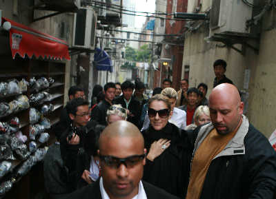 據(jù)了解,盡管席琳·迪翁沒有提出外游計劃,主辦方還是給她建議了豫園、外灘和南京路等歐美藝人常去的景點。不過,席琳·迪翁并沒有采納建議,而是驅(qū)車前往陜西南路232弄的一個小弄堂。在三名貼身外國保鏢的保護(hù)下,身著黑色長裙、戴超大墨鏡的席琳·迪翁下車,身后跟了約五名女性外籍工作人員。