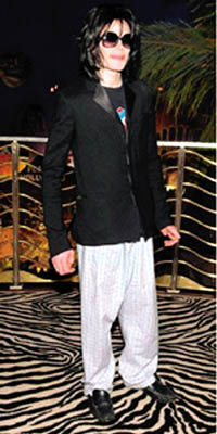 杰克遜近年飽受不利消息困擾,被指周身債之余,唱片銷(xiāo)量也大縮水,不過(guò)并沒(méi)有影響他慶祝50大壽的心情。上周四他現(xiàn)身賭城Planet Hollywood餐廳,與11歲兒子Prince Michael、10歲女兒Paris及6歲幼子Blanket一起吃晚飯,當(dāng)日杰克遜心情甚佳,對(duì)記者面露笑容,他坐著輪椅,全身用大披風(fēng)緊包,看來(lái)十分虛弱,而他拍照時(shí)西裝外套下露出的睡褲,格外引人注意。