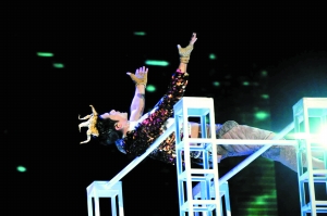 郭富城在3米高的鋼架作出的“托馬斯全旋”的體操動作。時報記者 龍成關(guān) 攝