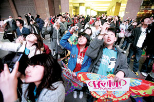 而表針指向9點10分時,MV卻沒有如期播出。正當(dāng)大家都仰頭盯著天幕看時,發(fā)現(xiàn)十幾名歌迷又同時朝一個方向跑去。