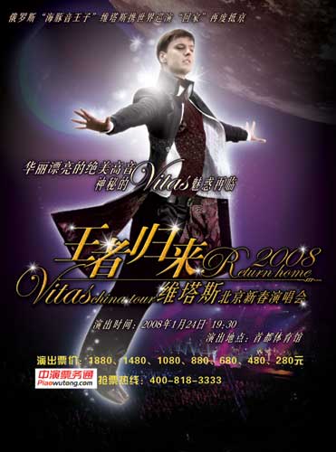 此外,演唱會(huì)上除了維塔斯的保留曲目和眾多挑戰(zhàn)人體極限的高難度曲目外,作為獻(xiàn)給中國觀眾的新春大禮,維塔斯認(rèn)真學(xué)習(xí)了中文,并將首次嘗試用中文來演唱。在加演曲目中,維塔斯還將演唱諸如《莫斯科郊外的晚上》等中國觀眾耳熟能詳?shù)那疤K聯(lián)老歌。這些細(xì)心的變化,都將為本次中國巡演平添許多精彩的中國元素。