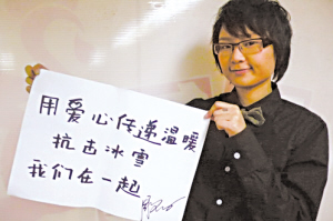 一場由中國曲藝家協(xié)會發(fā)起組織的“愛心化冰雪 真情暖人間——曲藝界抗冰雪賑災(zāi)大義演”慈善活動,將于2月5日晚19:30在北京民族宮大劇院舉辦。曲藝界同仁紛紛主動提出進行賑災(zāi)演出,陜西快板名家張保和趕寫趕排新節(jié)目,主辦單位之一的中國廣播藝術(shù)團為演出無償提供舞美、燈光、音響,民族宮大劇院為演出提供場地,北京人民廣播電臺作為協(xié)辦單位為義演滾動播發(fā)消息,著名演員姜昆、李金斗、鞏漢林、金珠、鞠萍、李揚等人不僅無償演出,而且還要在晚會現(xiàn)場捐款。據(jù)悉,主辦單位會在演出后,將所有演出收入、善款送給有關(guān)部門。