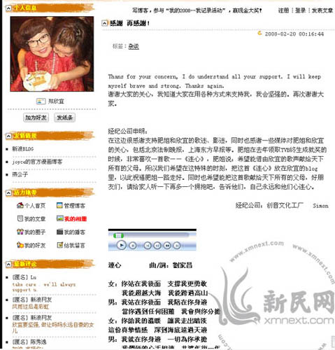 在這邊很感謝支持肥姐和欣宜的歌迷、影迷,同時(shí)也感謝一些媒體對肥姐和欣宜的關(guān)心,包括北京法制晚報(bào),上海東方早報(bào)等。肥姐在去年領(lǐng)取TVB終生成就獎(jiǎng)的時(shí)候,非常喜歡一首歌——《連心》,肥姐說:希望能借由欣宜的歌聲獻(xiàn)給天下所有的父母。所以我們希望在這特殊的時(shí)刻,把這首《連心》放在欣宜的blog里,以此祝福肥姐一路走好。同時(shí)也希望能把這首歌獻(xiàn)給天下所有的父母,好朋友們,請給家人聽一下再多一個(gè)擁抱吧,告訴他們,自己永遠(yuǎn)和他們心連心。